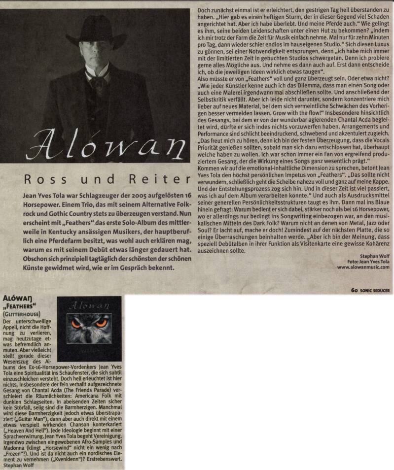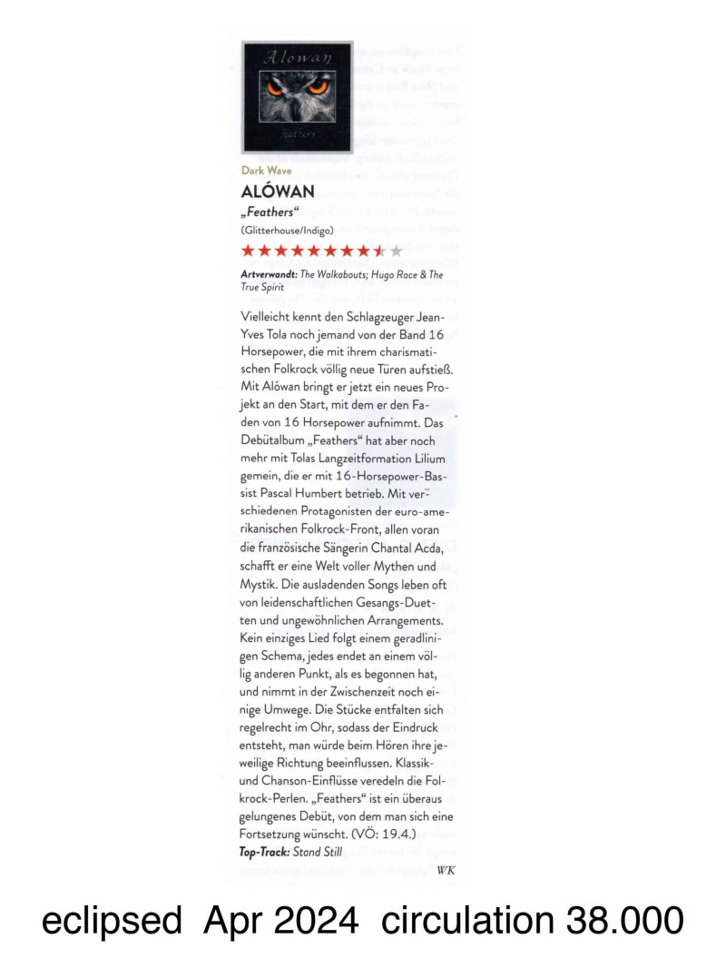 Maybe someone else knows the drummer Jean Yves Tola from the band 16 Horsepower, who broke new ground with their charismatic folk rock. With Alówaŋ he is now launching a new project with which he picks up the thread of 16 Horsepower. The debut album "Feathers" has even more in common with Tola's long-term formation Lilium, which is led by 16 Horsepower bassist Pascal Humbert. With various protagonists of the Euro-American folk rock front, especially the Belgian singer Chantal Acda, he creates a world full of myths and mysticism. The expansive songs often come to life with passionate vocal duets and unusual arrangements. Not a single song follows a straight pattern, each one ends at a completely different point than it began and takes a few detours in the meantime. The pieces literally unfold in your ear, giving the impression that you are influencing their respective direction while listening. Classical and chanson influences refine the folk rock pearls. "Feathers" is an extremely successful debut that one wishes for a sequel.